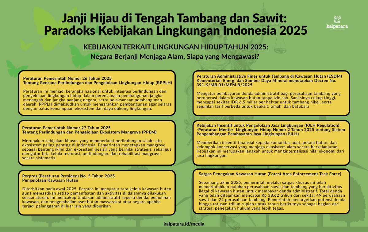 Di sektor kebijakan, 2025 menandai upaya pemerintah memperkuat instrumen perlindungan lingkungan, termasuk wacana denda besar bagi pelaku perusakan hutan dan pencemaran (PermenLHK No. 14/2024). Namun, penegakan hukum masih menjadi titik lemah. Sejumlah kasus lingkungan besar berjalan lambat, bahkan mandek, memunculkan pertanyaan lama: seberapa serius negara menempatkan lingkungan hidup ketika berhadapan dengan kepentingan ekonomi?