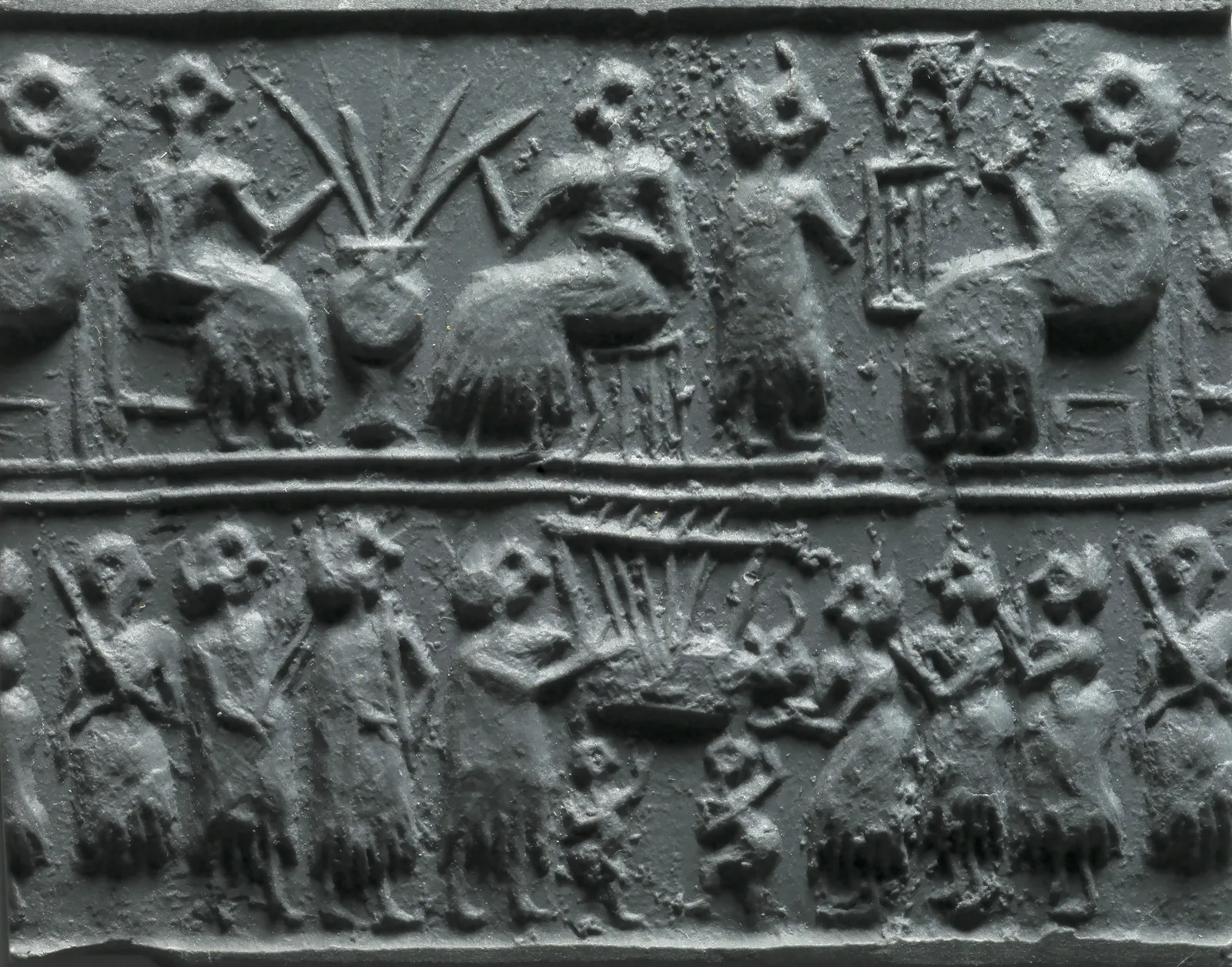 Kedua, ada bukti visual. Pada periode ini, masyarakat Mesopotamia meninggalkan banyak gambar kehidupan sehari-hari dalam bentuk segel silinder, batu kecil berbentuk silinder yang diukir dan digulirkan di atas tablet tanah liat sebagai tanda otorisasi atau “tanda tangan”. Pada segel-segel inilah para peneliti berulang kali menemukan adegan perjamuan: orang-orang minum dari sebuah kendi besar menggunakan tabung panjang yang diarahkan ke mulut mereka.