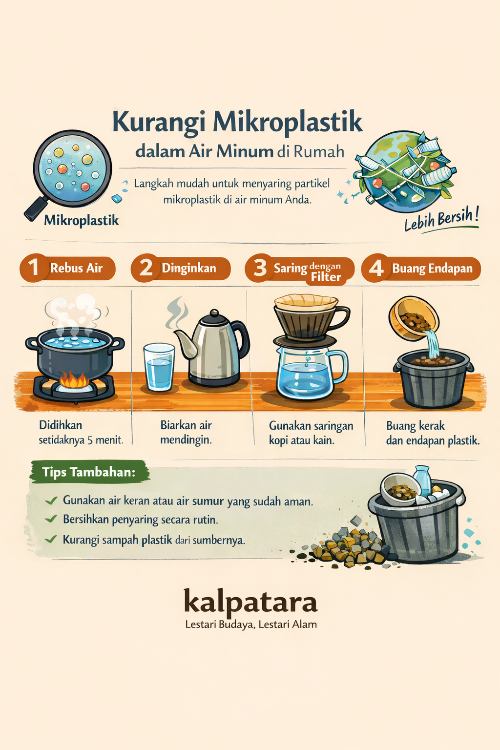 Metode ini tidak menggantikan teknologi penyaringan maju seperti Reverse Osmosis (RO) atau filtrasi mikro/ultrafiltrasi, tetapi bisa menjadi langkah pelindung tambahan untuk keluarga di area dengan kadar mikroplastik tinggi.